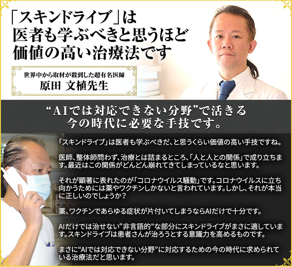 医療界の最前線で活躍している医師がこの治療法を「医者も学ぶべき」と絶賛するほど、人体を深く理解して研究した結果生み出されたのが「スキンドライブ」なのです。