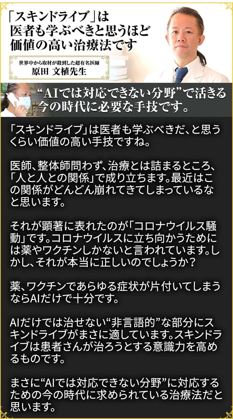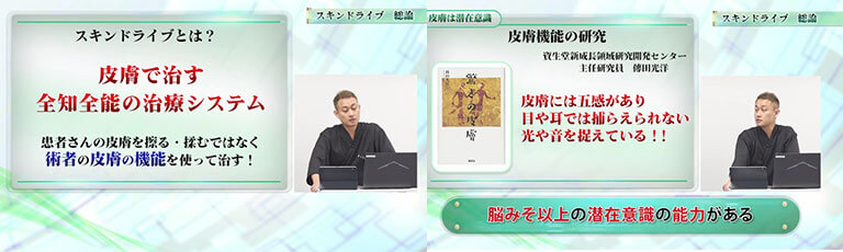 ワクチンや薬でしか対応できない医療の現場に疑問を持ち、人体に対して新たな考え方や効果的な施術テクニックはスキンドライブが担う分野だとおっしゃっています。