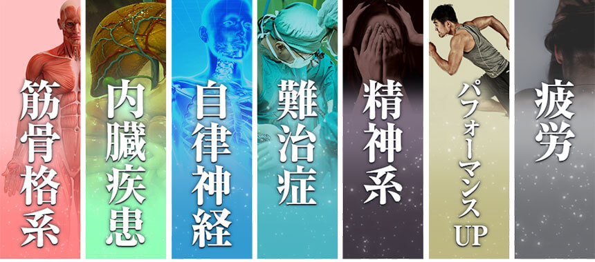 パーキンソン症/うつ病/胸郭出口症候群/アトピー/不妊症/視覚障害/側弯症/ぎっくり腰/ぎっくり背中/不整脈/不眠症/トラウマ/子宮筋腫/逆流性食道炎/パニック障害/坐骨神経痛/無呼吸症候群/顎関節症/腰椎ヘルニア/自律神経失調症/ストレートネック/脊柱管狭窄症/バセドウ病/緑内障/花粉症/肉離れ/五十肩/四十肩/頭痛/更年期障害/耳鳴り/眩暈/ばね指/シンスプリント/眼精疲労/腰痛/顎関節痛/肋間神経痛/手根管症候群/足底筋膜炎/オスグッド/捻挫/突発性難聴/腱鞘炎/テニス肘/モートン病/月経前症候群/手足のしびれ/偏平足/メニエール/すべり症/変形性股関節症/夜尿症/内反小趾/野球肘/分離症/変形性膝関節症/強直性脊柱炎/変形性脊柱症/石炭沈着性腱板炎/黄色靭帯骨化症/首こり/肩こり/ランナー膝/副腎疲労症候群/頚骨腕症候群/上腕二頭筋長頭腱炎/後縦靭帯骨化症/起立性調整障害/過敏性腸症候群/外反母趾/股関節痛/甲状腺機能低下症/へバーデン結節/顔面神経麻痺/前立腺肥大症/胃下垂/ドライアイ/頚椎椎間板ヘルニア/梨状筋症候群/頚椎症/外反肘/腸脛靭帯炎/心因性症候群/前庭神経炎/肘部管症候群/膀胱炎/子宮内膜症/生理痛/排卵痛/不安神経症/子宮腺筋症/メージュ症候群/鵞足炎/寝違い/耳管開放症/耳管狭窄症/頚性神経筋症候群/慢性疲労症候群/むずむず病/産後うつ/機能性胃腸障害/背部痛/足底筋膜炎/肩関節周囲炎/野球肘/坐骨神経痛/変形性膝関節症/先天性股関節症/頭痛/眼精疲労/噛みしめ/自律神経失調症/歯ぎしり/副腎疲労/骨格矯正/むずむず脚症候群/神経性嘔吐症/睡眠呼吸障害/線維筋痛症/顔面神経麻痺/シェーグレン症候群/ネフローゼ症候群/インピンジメント症候群/レイノー病/ガングリオン/上殿神経絞扼症/ドケルバン病/ロコモティブシンドローム/気管支喘息/モートン病/女性疾患/ED/インフルエンザ/ノロウイルス/etc…