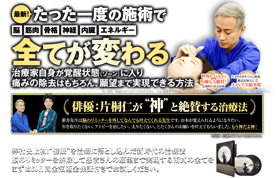 他の手技教材とは何が違いますか? - 他の手技との最も大きな違いは、痛みや不調にとどまらず脳の潜在能力を引き出しあらゆる願望を実現するのに役立つ点です。また、患者さんだけでなくあなたの潜在能力も引き出すことができるので、セルフケアに用いたり、いまお使いの手技の治療効果をより引き出すのにも使えます。新しいテクニックが身につくだけでなく、あなたが今使っている手技も格段にレベルアップする、まさに一石二鳥な教材です。あなたも名医や達人と呼ばれる領域に足を踏み入れて、たくさんの患者さんを幸せにしてあげてください!