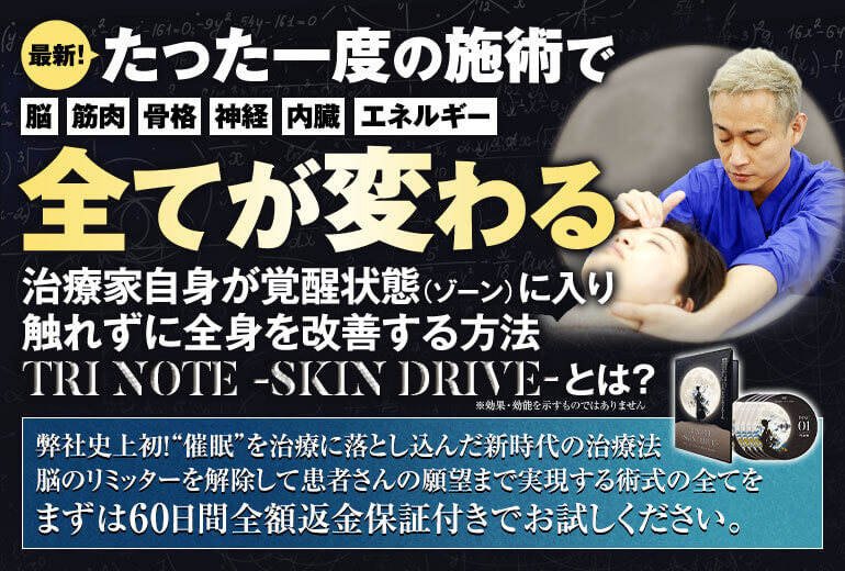 たくさんのセミナーに参加したり教材を学んだり、武術を学び整体に取り入れることもありました。催眠やヒーリング、気功など身体に触れない治療に関しても幅広く学びました。そして、すべてをつなぎ合わせて手技テクニックとして体系化したのが「TRI NOTE -SKIN DRIVE-」です。