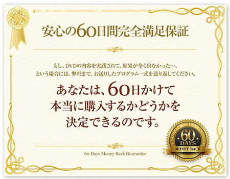| 特典サポート ノーリスクでお試しください!万が一満足できなかった場合 無条件でDVD代金が返ってくる60日間の100%全額返金保証付き |