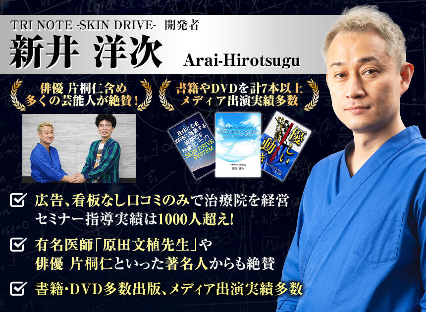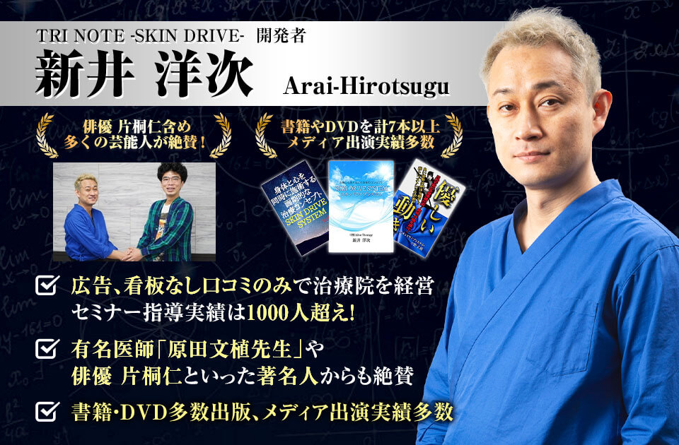 これはどのような教材ですか? - 本教材は、新井先生が開発した「TRI NOTE -SKIN DRIVE-」という施術法の具体的なアプローチ方法を収録したDVD教材です。脳のリミッターを外して潜在意識、全身の不調まで改善させる最新手技が収録されています。全身の痛みや精神由来のトラウマなどの消失はもちろん、身体能力や記憶力の向上などあらゆる願望の実現まで可能にした魔法のランプのような治療法です。手技に限らず、その治療効果を最大限引き出すための姿勢の取り方やセルフケア映像など、手技DVDで必要とされている要素を完全網羅。ご覧いただいた瞬間から、あなたの人生を変えるほどの自信があるDVD教材です。